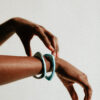 Bracelet rigide en plastique recyclé, ce jonc unique révèle un subtil contraste de formes : l’intérieur arrondi épouse délicatement le poignet, tandis que l’extérieur aux lignes triangulaires capte la lumière avec modernité.